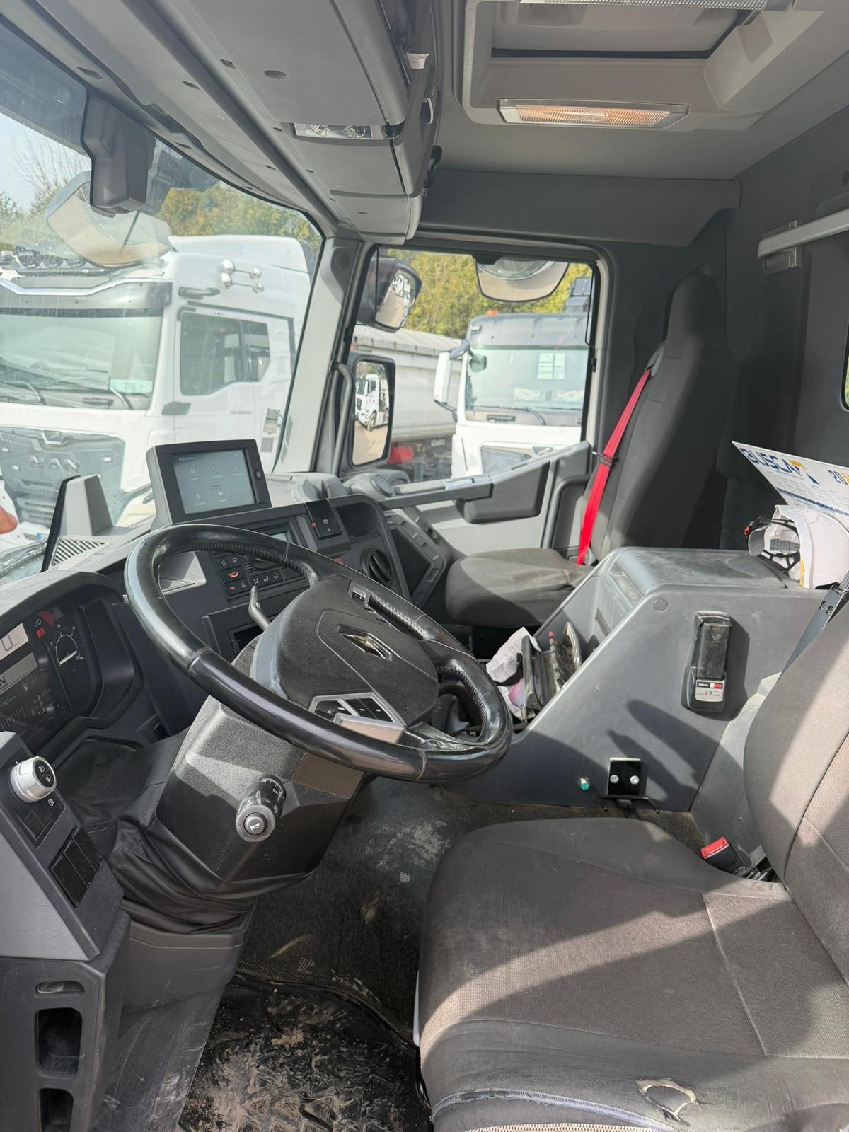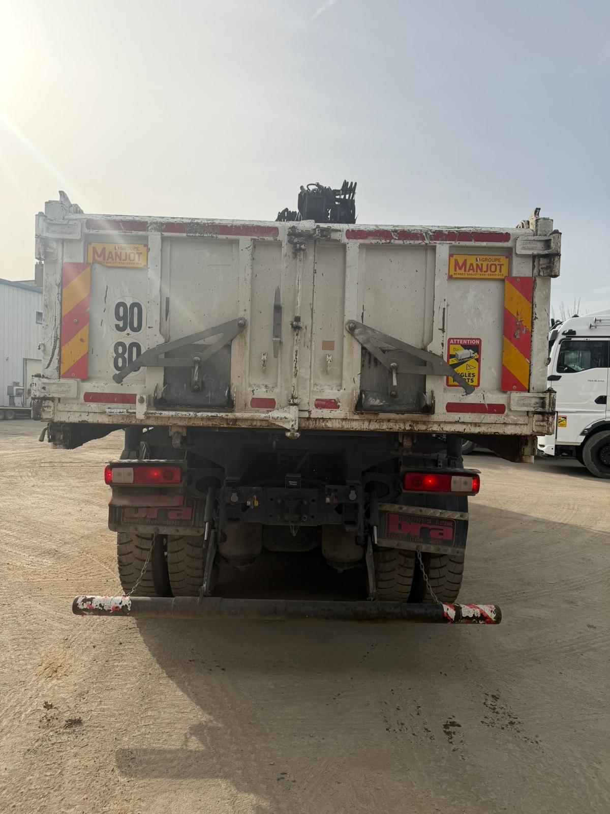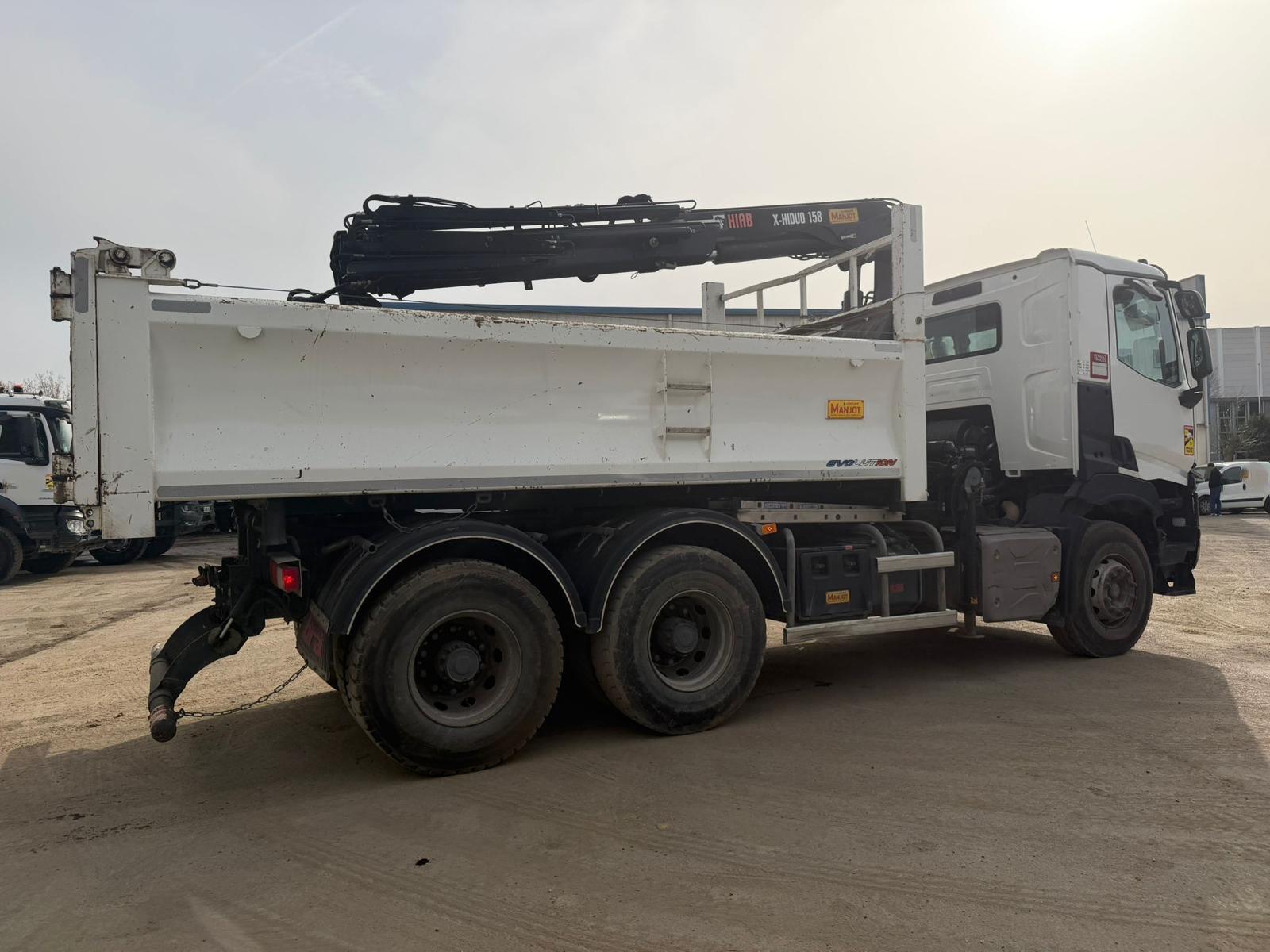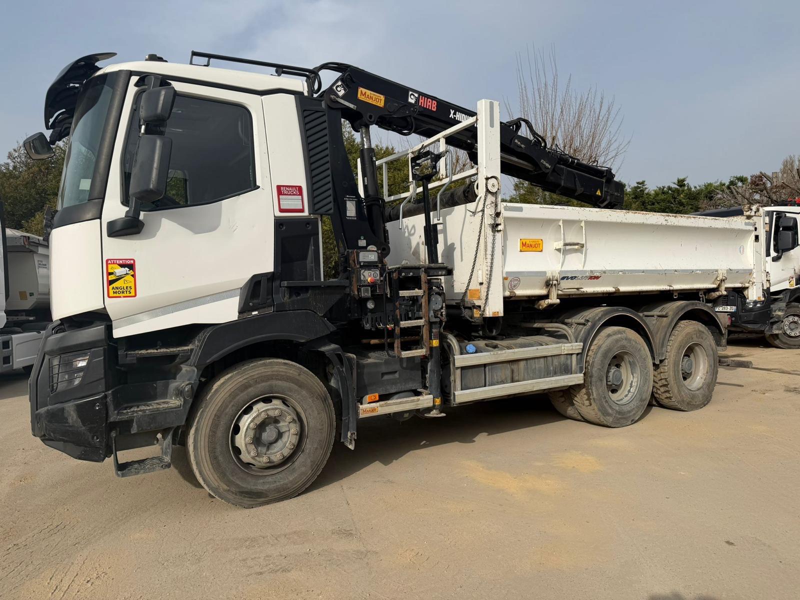 Camion Renault C460 6x4 équipé d’une benne basculante acier MANJOT et d’une grue HIAB X-HIDUO 158 montée derrière cabine